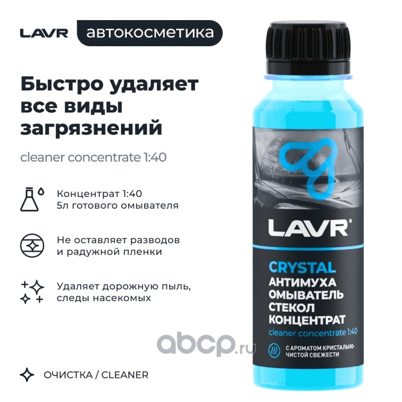 Ищете хороший летний омыватель стекол? Превратите обычную или дистиллированную воду в средство с прекрасными моющими способностями с концентратом Омывателя стекол Антимуха Crystal от LAVR. Экономично и эффективно! Состав разработан на основе качественных и проверенных компонентов, он не только справляется с загрязнениями, но и предохраняет систему омывания от коррозии и засоров. Плюс ко всему обладает нейтральным запахом.